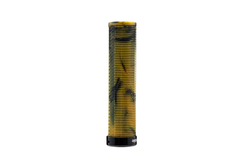 A straight profile, a lock-on grip that combines a ribbed, mushroom pattern on the palm side for comfort, and a hex-pattern on the underside for grip.