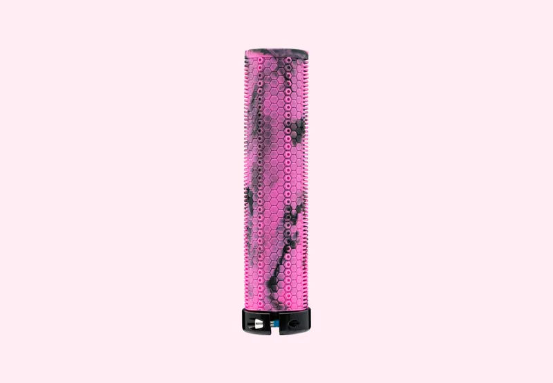 A straight profile, a lock-on grip that combines a ribbed, mushroom pattern on the palm side for comfort, and a hex-pattern on the underside for grip.