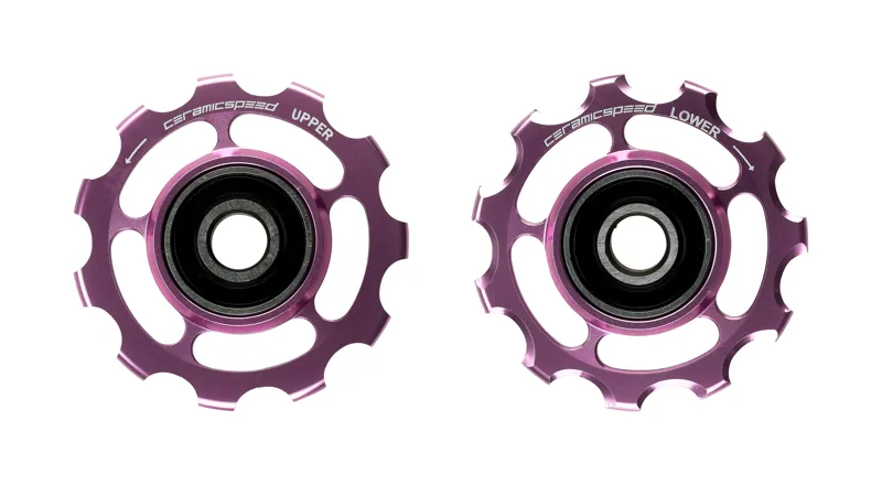 There are three choices for sram. The first is our standard: machined aluminum pulleys with our stock ceramicspeed balls installed in our hardened-steel races. These kill the competition in tests. The second is taking those standard bearings and installing them in machined titanium pulleys. The third is those same machined titanium pulleys with our ceramicspeed balls installed in coated, hardened-steel races.